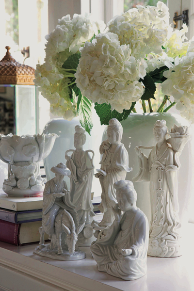 A detail in the room shows part of Mary’s collection of blanc de Chine and Quan Yin figurines.