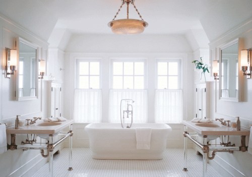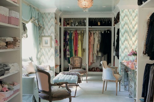 And finally, an overview of the dressing room. I could live in here happily. Mary says she wanted the “closet” to have a lounging area as if it were an elegant dress salon from a bygone era. It has 18th century chairs and a rock-crystal chandelier.