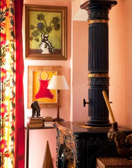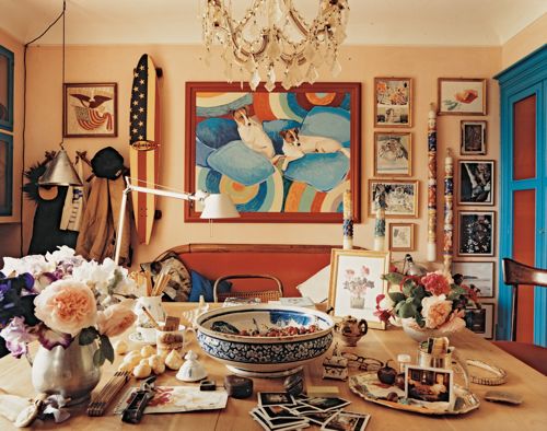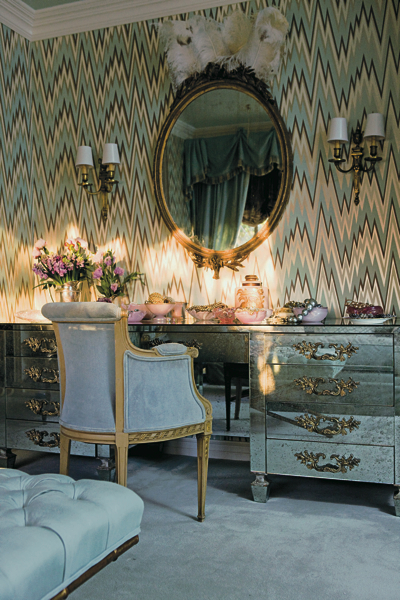 Mary’s beyond wonderful dressing table, a restored mirrored piece from the 1926 Buster Keaton estate in Beverly Hills, a home she helped to remodel. The fanciful hardware is original. The top is covered with Mary’s collection of jewelry-filled pink Murano glass ashtrays which she inherited from her grandmother. I absolutely love, love, love the flame-stitch wallpaper, which I believe is Osborne & Little. She writes that the contemporary pattern keeps the room from feeling too “old ladyish.” Note the fun feathers Mary tucked at hte top of the gilded mirror to hide some damage. She calls it a “tad showgirly” but “amusing for a closet.” Heavenly.