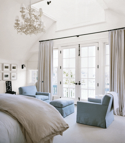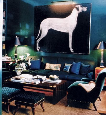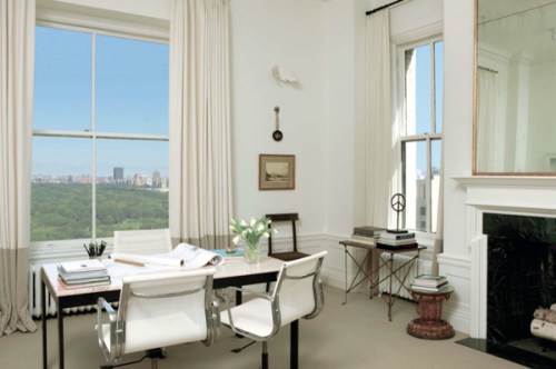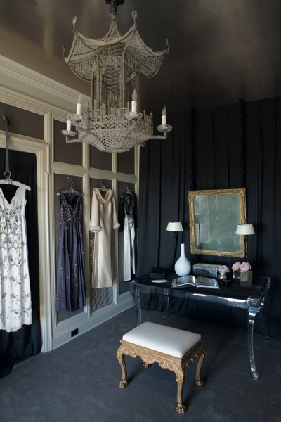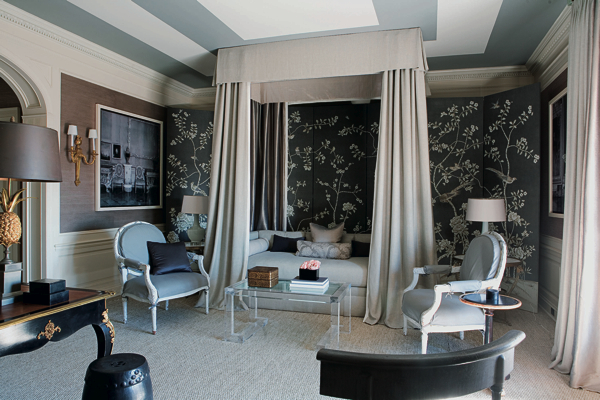 Oh, to have this dressing room, those dresses, and that life. (Though it is the Veranda Greystone Mansion Show House.) The walls are paneled in gray suede, and the rear wall is draped with pleated charcoal faille. She added a velvet inset to the top of the fabulous acrylic Allan Knight vanity. The gilded mirror, which looks like it’s floating, hangs from ruched-fabric-covered chains. The ceiling is covered in silver paper from Phillip Jeffries, and the pagoda chandelier, which looks like wicker, is actually crystal. The dresses? From Mary’s personal collection of vintage couture.