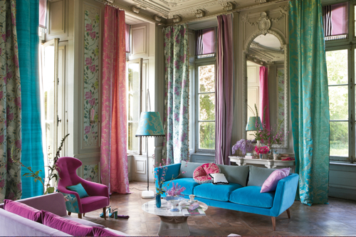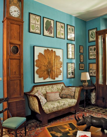 Her sitting room is very symmetrical – apparently her friends tease her that it looks like she’s about to hold a board meeting here. The color scheme is based on a bolt of vintage 1950s brown and aqua striped fabric, now the square pillows on the sofa. The drapes are matelassé from Ralph Lauren, trimmed with carved wooden bells and gauffrage ribbon.