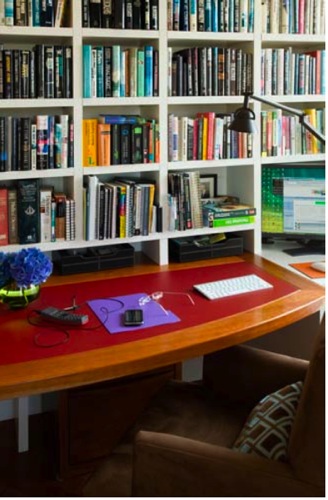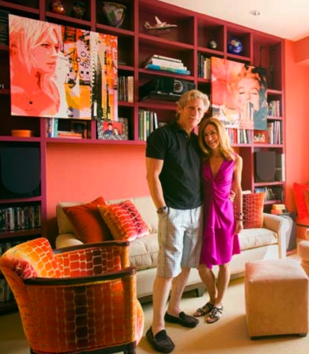 You might not realize it, but there is a lot of white in this living room. The round acrylic tables are by Nancy Corzine (whose new book I wrote about yesterday). The stools are Russian, found in Paris and uphostered in two different fabrics to create a striped effect. These stools inspired the Anastasia bench in Suzanne’s furniture line for Hickory Chair.
