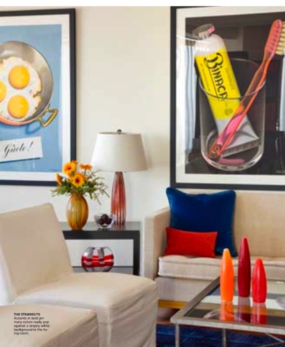 The floors and fireplace wall in this beach house are painted a cool, slean white, while the rest of the deocr is done in various shades of soothing blue. The walls in the sitting room beyond are sky blue; the slipcover on the chair is almost a French blue; the rug is striped in other blues. The blue balls are iridescent blown glass. The painting is by Dusty Griffith. Overall, a very watery space.