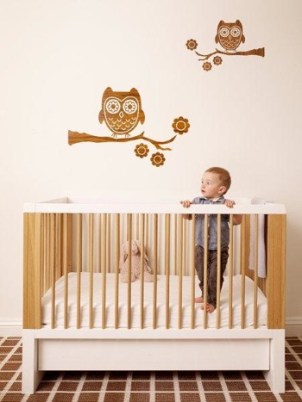 Weiss chose ‘Wood Owl’ wall decals from Etsy rather than artwork in case of an earthquake. The crib is the ‘Cabine’ by Netto Collection.