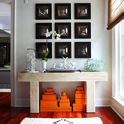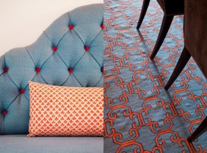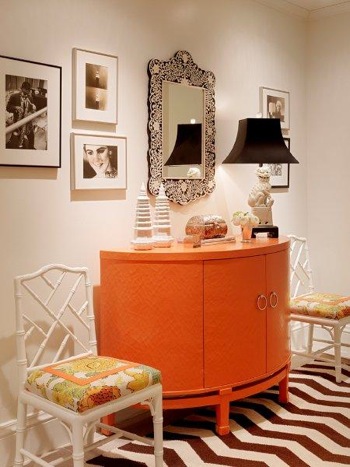 A persimmon demi-lune chest in the mudroom is flanked by Jonathan Adler ‘Chippendale’ side chairs in white lacquer, upholstered with a Palm Beach, ’70s style floral. The rug is from West Elm ‘Zig Zag.’