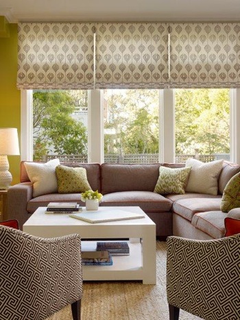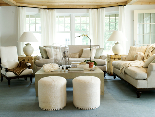 The neutral colored sofa is piped in coral, a color that references the ceiling of the adjoining dining room. The chairs are upholstered in Schumacher ‘Saint Tropez’ in ‘Java,’ a durable outdoor fabric.