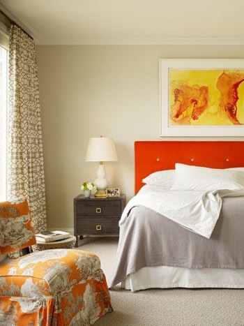 The guest room was pulled together on a budget. Weiss swapped the chrome hardware on the bedside tables with gold and re-purposed an old headboard in inexpensive orange velvet. The toile slipper chair is a nod to the wife’s preppy East Coast roots. The draperies are Kravet ‘Pelago’ in ‘Haze.’