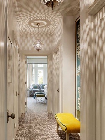 For the dressing room hallway of the master suite, Weiss wanted, “Just a little moment there.” They went with inexpensive lanterns from a Moroccan import place that cast lacy shadows on the walls and ceiling. A Hickory Chair bench upholstered in a deep yellow and edged with teal sits in front of a niche hung with a framed section of hand-painted wallpaper.