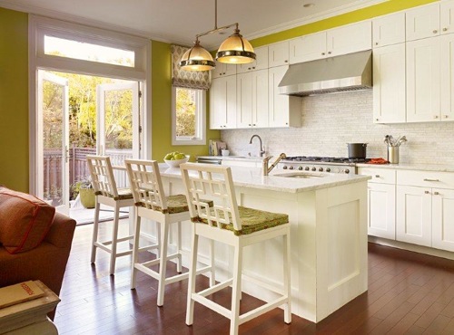 Mixing high and low, Weiss upholstered West Elm bar stools with Muriel Brandolini ‘Chartreuse 2’ that she had laminated for easy clean up. The acid green wall color is Fine Paints of Europe #S2040-G80Y, which continues into the family room, below.