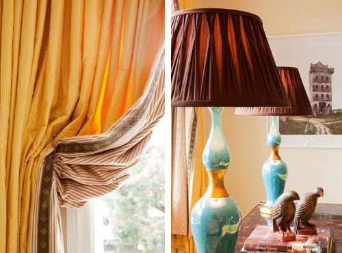 Initially the homeowner thought that silk curtains might be “too grown up,” but loved the idea once Weiss dressed them down with a cotton ticking lining. A pair of vintage lamps mirror the symmetry of the maize-colored silk drapes.
