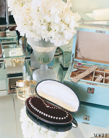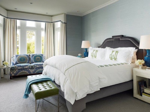 The bed in the master suite is made in luxuious white Leontine linens monogrammed in apple green, picking up on the color of the tufted Oly Studio ‘Jonathan’ bench upholstered in Holly Hunt ‘Stingray’ leather in ‘Irish Sea.’ Weiss designed the headboard, upholstered in blue mohair with nail head detailing. The loveseat is covered with Donghia ‘Suzani’ in ‘Blue Bliss.” Christopher Spitzmiller porcelain lamps top the bedside tables.