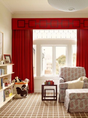 The nursery won’t need de-babyfying. Formal red drapes and valance are sophisticated but not to. An existing armchair and ottoman was redonein Peter Dunham ‘Kashmir Paisley’ linen. The checked wall-to-wall carpet works well for kids—it’s soft and stain-resistant.