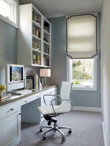 The adjoining study boasts custom cabinetry and an Eames Management Chair in white leather. The neutral Roman shade is edged in tealtape, notched at the corners, and the silver carpet is from Stark.