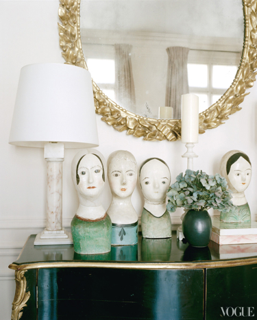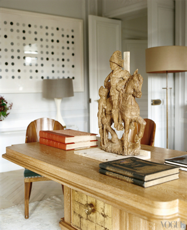 At the far end of the drawing room is a c. 1930s table by André Arbus. On it rests a rare medieval wooden carving of Saint Martin on a horse, rescued, Scott told Vogue, from Jagger’s château in the Loire. “The piece was sitting there in a niche above the chapel door, and someone had painted him blue. So I took him down and sent him to a restorer recommended by the Louvre.” Damien Hirst’s “Dots” hangs in the background.