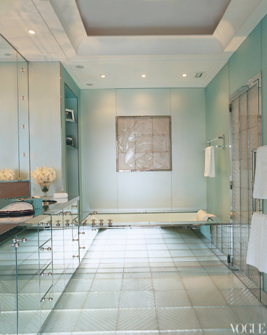 The Art Deco bathroom is by Lalique, made in 1926 for a house in Paris. Jagger purchased the ensemble at auction in the seventies and packed it away in the country.  There were glass doors patterned with fountains of bubbles, floor and wall tiles, a mirrored bathtub and cabinets, and a plaque of tiles depicting leaping koi.