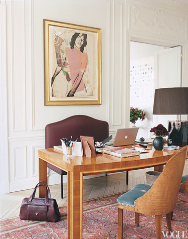 A Warhol portrait of a young Mick Jagger hangs in her study, which is stacked with fashion-history and art books.