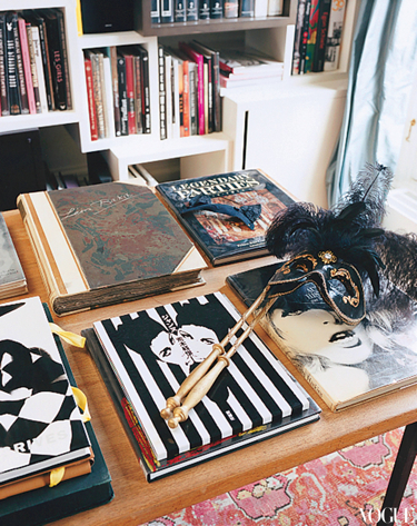 In the library, a pair of feathered masquerade masks sits among fashion monographs.