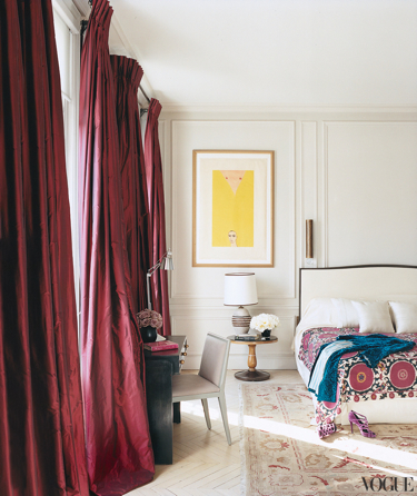 The guest room. Painting by Francesco Clemente. Curtains throughout were dyed by the same silk manufacturers Scott uses to create her taffeta evening dresses.