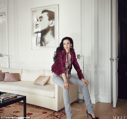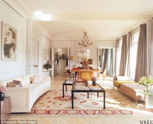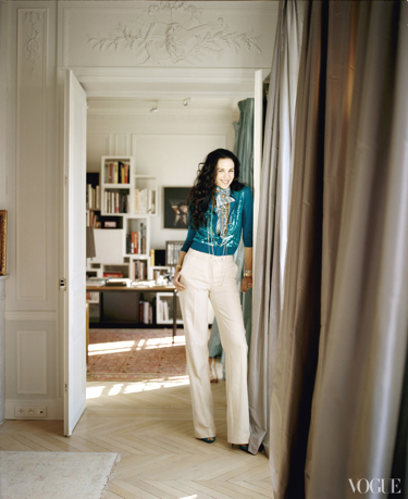 The low, curved sofa in the drawing room is covered in cream bouclé tweed from the forties that  “has the air of a vintage Balenciaga suit.” She found it  in a store on the Rue de Lille. She tells Vogue, “Once you’ve been here, you get to know there’s this U-shaped trail of antiques places to look at along the Rue de Beaune, up the Rue de Lille and the Rue des Saints-Pères.”