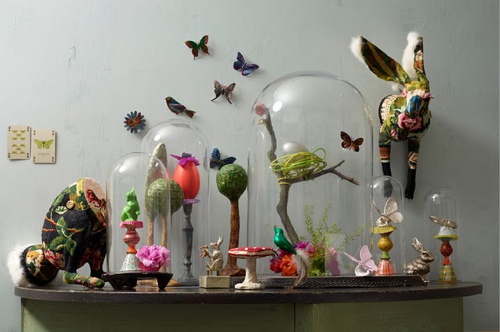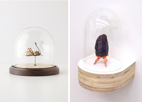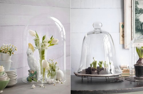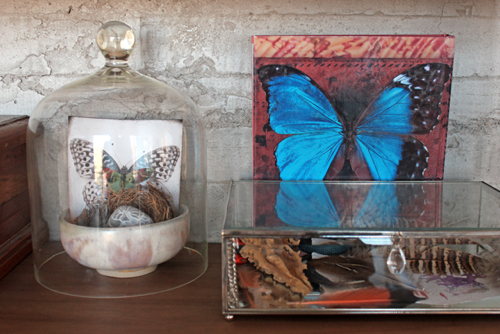 Anything can be art under glass. I first heard this from stylist Kara Butterfield, who displayed rocks in and under tumblers on her mantle in Boston. She told me,  “If you put anything in a glass, or behind glass it celebrates it, gives it meaning, like a picture in a frame.”  Others seem to be catching on. Bell jars, or cloches, seem to be on every console and coffee table, containing anything from fawn figurines to succulents or matchbox cars to brass nails. J. Crew has even been showcasing shoes under them. Here’s a look at 35 examples which includes live plants, dead insects, and inanimate objects from the ordinary to intricate.
