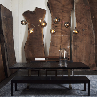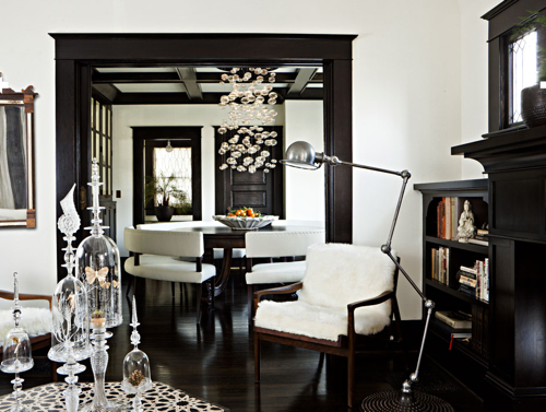The dining table is vintage 1950s Paul McCobb and the chairs, which are covered in dark blue mohair on the front and stamped lizard on the back, are Baker ‘St. Germain’ chairs from the Thomas Pheasant Collection. They experimented with a number of fancy Murano chandeliers, but finally settled on a simple and inexpensive brass one from Circa Lighting.