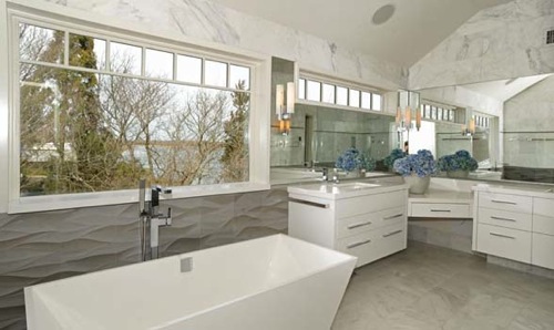 As winter eases and summer slowly (too slowly) comes forth, one of the things I look forward to is taking baths again. Our condo in Boston has an oversize (too big) shower, but the only tub is a standard one (too small) in the boys’ bathroom. My favorite room at our place on the Cape may be our wonderful, sky blue glass mosaic tile walled bathroom with its deep bathtub (just right). While there isn’t an over-the-top view (we saved the distant ocean vista for the bedroom), it is bordered by two large windows looking out to the woods, including a couple of birch trees, which I love.