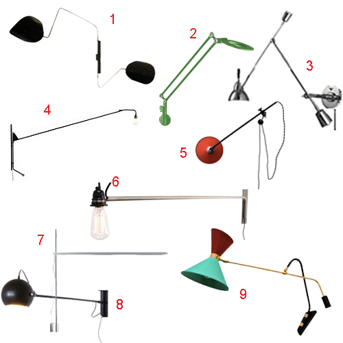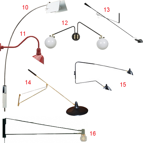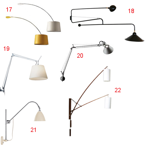 I’m trying to come up with a spot in my apartment where I could install one of these super long-armed wall lamps. I’m over the industrial factory look (for my own space anyway). I like the bare bones minimal ones and also the Italian vintage styles from the ’50s, though I fear they’re a bit on the whimsical side for me. I think #15 is my favorite. Maybe in the family room, over the sofa? That room could use a little architectural-like interest. It’s much more practical than an annoying floor lamp. Many of these are pricey; the style hasn’t been knocked off in a frenzy by the usual suspects yet, so I didn’t really find any truly “low” options.