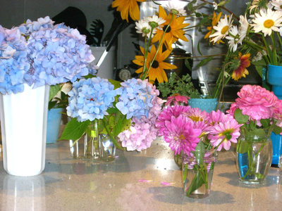 Ok, not really my shop, just my kitchen. But I must say I am impressed that these came from my garden, even if I didn’t really plant them all myself. But even the cutting and arranging takes time. (This photo caught the process midway.) I now know why those who can have flowers done for their homes regularly. The whole enterprise can take over an hour, never mind the time spent catching (and disposing of) the spiders that inevitably hop all over the countertop. And then there’s the discarding of the dead blooms a few days later. But while they’re thriving, they’re simply gorgeous.