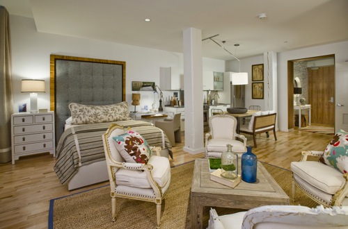 The directive was to help would-be buyers conceptualize how to make the most of a studio. Stefanon needed to show how one can fashion a single room into a living space that functions well for both entertaining and private time, while remaining organized and, of course, stylish. No problem.