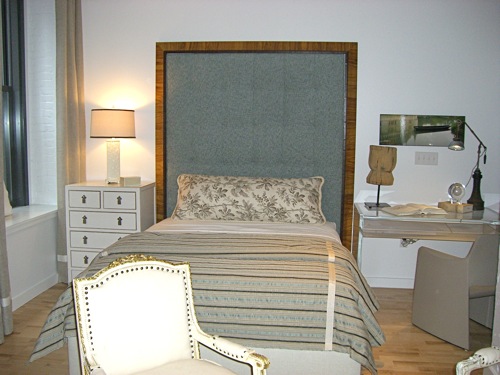 The crisp, upholsterd headboard fits trimly in the small space.