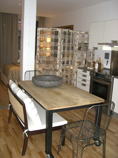 Stefanon incorporates earthy elements, like this rough hewn table, into the dining area. The chairs are on casters so they can be easily transported during a party.