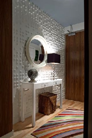Andrew relocated the closets in order to incorporate a console. He chose a stainless steel piece that you might find in a lab. He added a textured wall covering and wood panels.