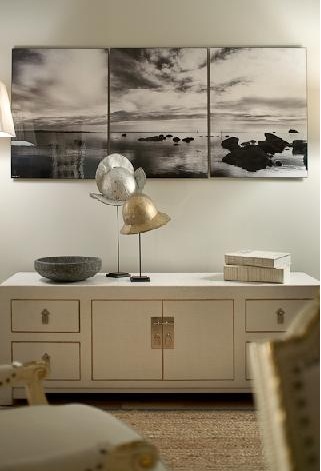 Across from the bed is another custom crackle cabinet. Stefanon hung black & white beach photos by Roy Barloga above because “everyone knows that’s where you’d put the TV, so I did something more artistic.” The sculptures are old helmets on stands