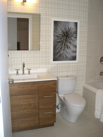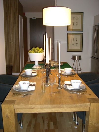 This spring, Jessica Danforth of Kortenhaus Communications (love her!) brought me on a whirlwind tour of four different apartments at FP3 in Fort Point Channel, followed by lunch at Barbara Lynch’s Sportello. (Delicious, and really well-designed.) The neighborhood is industrial and artsy, and the building, designed by David Hacin, reflects those influences. The lobby even even includes an exhibition gallery. In addition to three model apartments (I just handed in an article for Stuff on the studio unit designed by John Stefanon, which I’ll blog about once it’s published), Jessica got permission to show me a privately owned two-bedroom designed by Andrew Terrat of Terrat Elms.