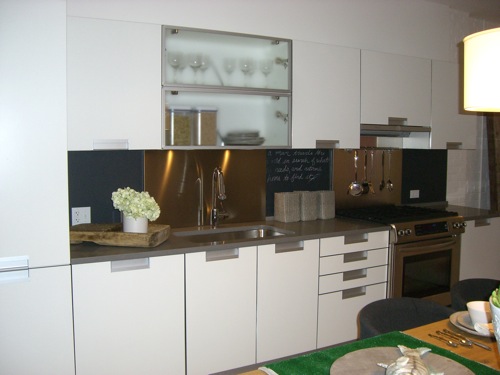 This is the standard kitchen. Love the addition of the blackboard, both as a design and practical element. The cloudy glass cabinetry provides a bit of airy relief from the opaque panels. Adding just one section is a lot cheaper than doing all the upper cabinets in that style, but makes a noticeable impact.