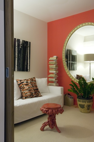 An amazing red wall in the media room gives an unexpected zing. And that enormous mirror really opens up the room. The effect reminds me of a wall with a circular doorway at the university in Taiwan where I once studied.
