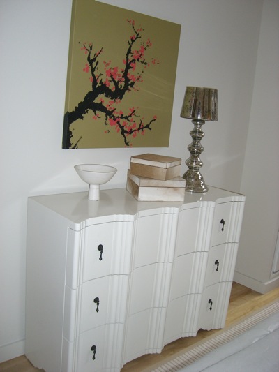 I adore the wavy front of this white lacquered dresser.