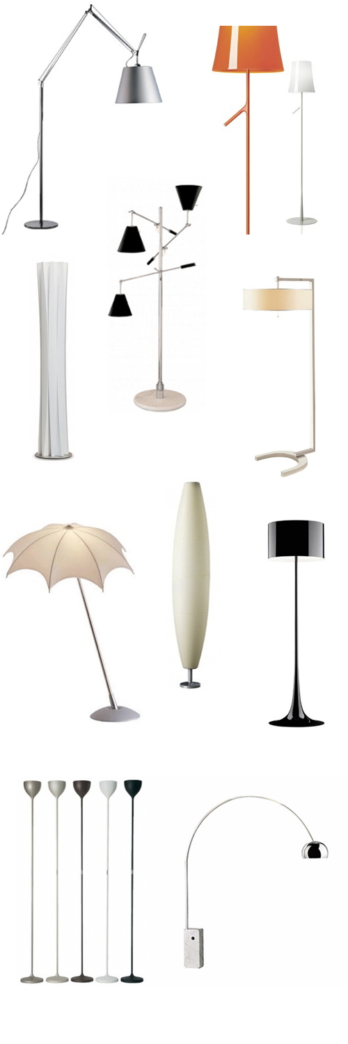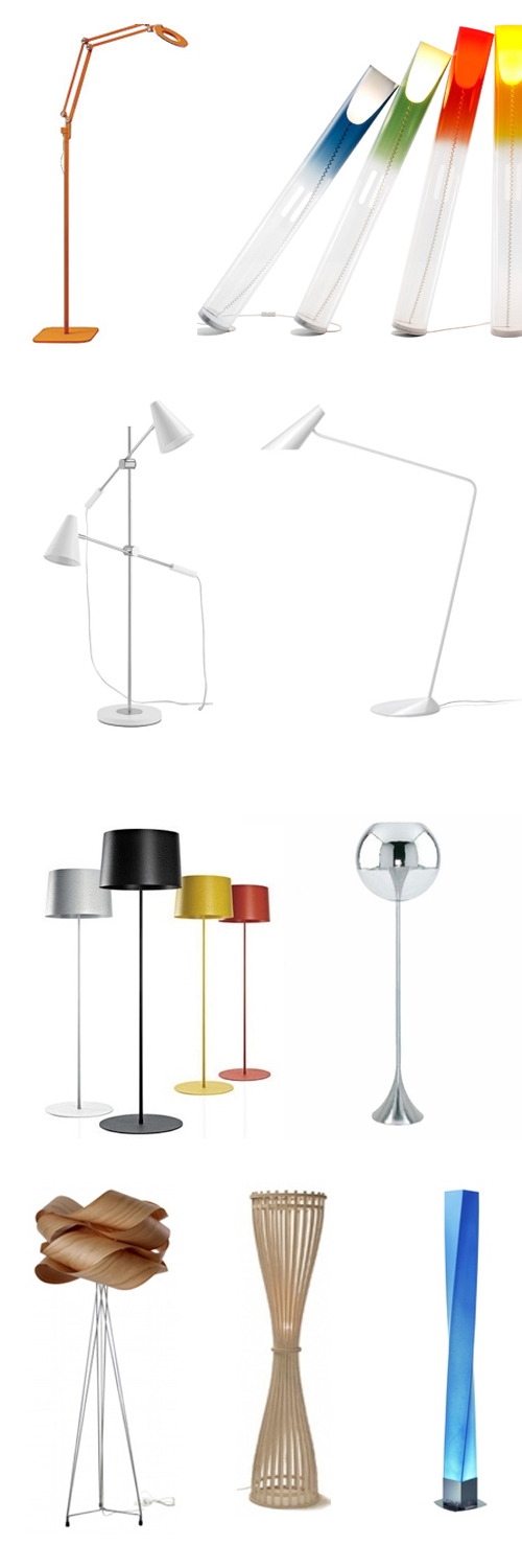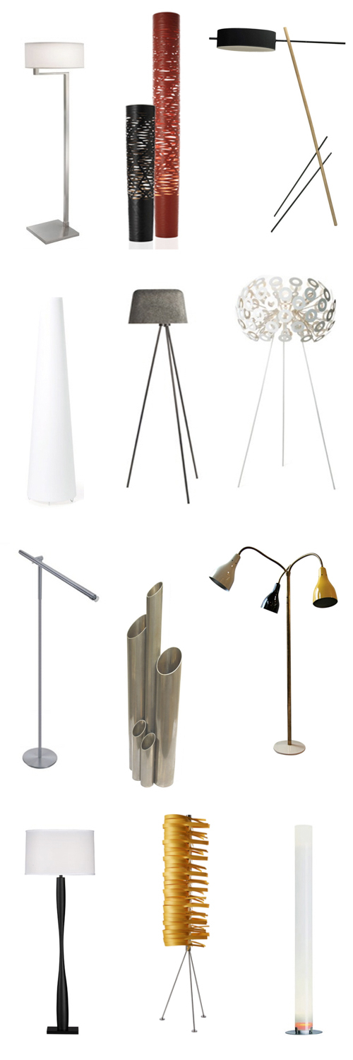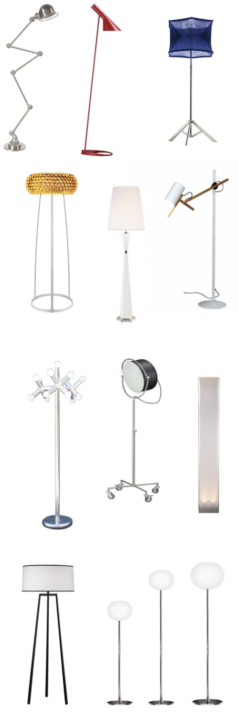 Following up on last week’s Montage: 43 Rooms with Floor Lamps, here are 51 floor lamps in lots of different colors, finishes, shapes, and styles. Scroll down for links for where to buy.