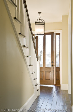 The crew restored the hand-carved wood banister and newel post in the entryway.