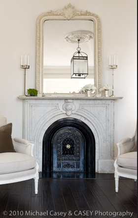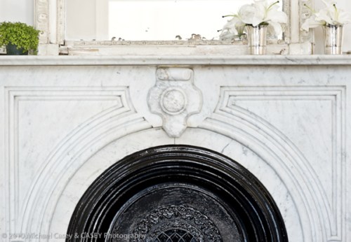 The crew was able to salvage the original marble fireplace surround. They removed it for cleaning and repairs, then reinstalled it.