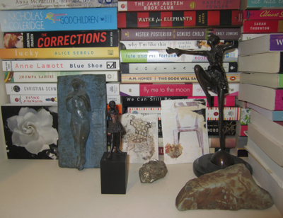 Here’s a shot of my bedroom bookshelf. (Excuse the low brow reading material.) The pieces aren’t exactly artfully arranged, but a few are quite special. Starting from the left:  black & white flower ‘Fusion Foto Bloc’ by Debbie Krim purchased at her SoWa studio; one of my most cherished works, a Romolo Del Deo bronze nude from Berta Walker Gallery in Provincetown, a holiday gift from my mother-in-law because I’ve always admired hers. Another gift from my mother-in-law, a miniature wooden Degas ballerina from the Met Museum gift shop. Her mother-in-law (my husband’s grandmother) gave it to her. She passed it down to me this past December. The two chairs prints I made a couple of summers ago after taking a class at Castle Hill. The small rock is a chunk of pyrite and the large rock on the right we found on a Truro beach. Finally, the outstretched ballerina on the right is a piece I’ve had for much of my life, passed down from my grandmother, who was an antiques dealer. It is bronze on a green marble base but don’t know anything else about it.